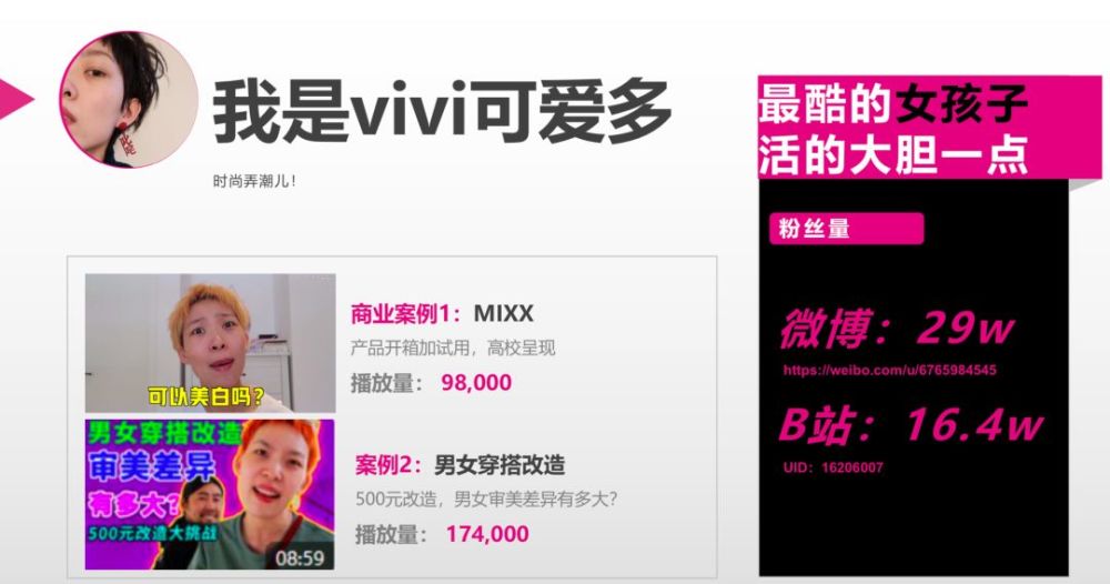 “今年新签的vivi可爱多就是一个我很欣赏的网红博主。她是一个与众不同的人,乐于表现,善于表达,个人形象感鲜明。”