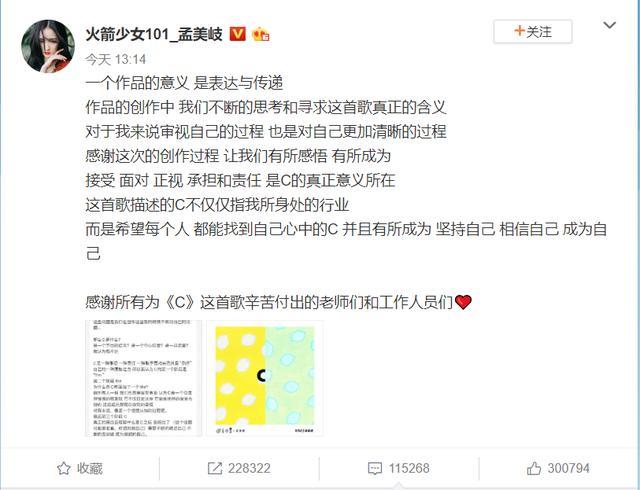 孟美岐则表示:“接受、面对、正视、承担和责任,是C的真正意义所在。这首歌描述的C不仅仅指我所身处的行业,而是希望每个人都能找到自己心中的C,并且有所成为。坚持自己,相信自己,成为自己。”