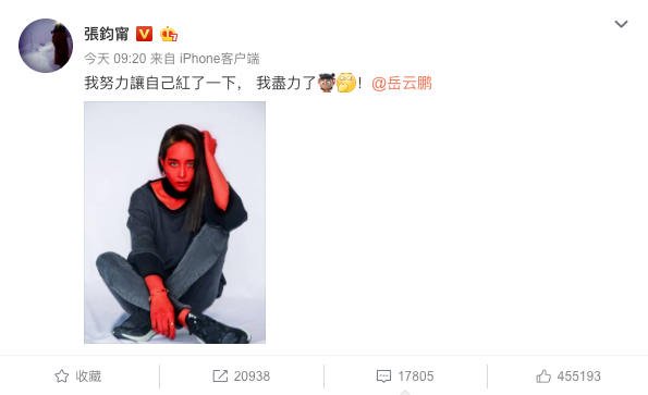 今天早上,张钧甯发了一张“涂红”了的照片,巧妙的回应了岳云鹏在节目中的言论。
