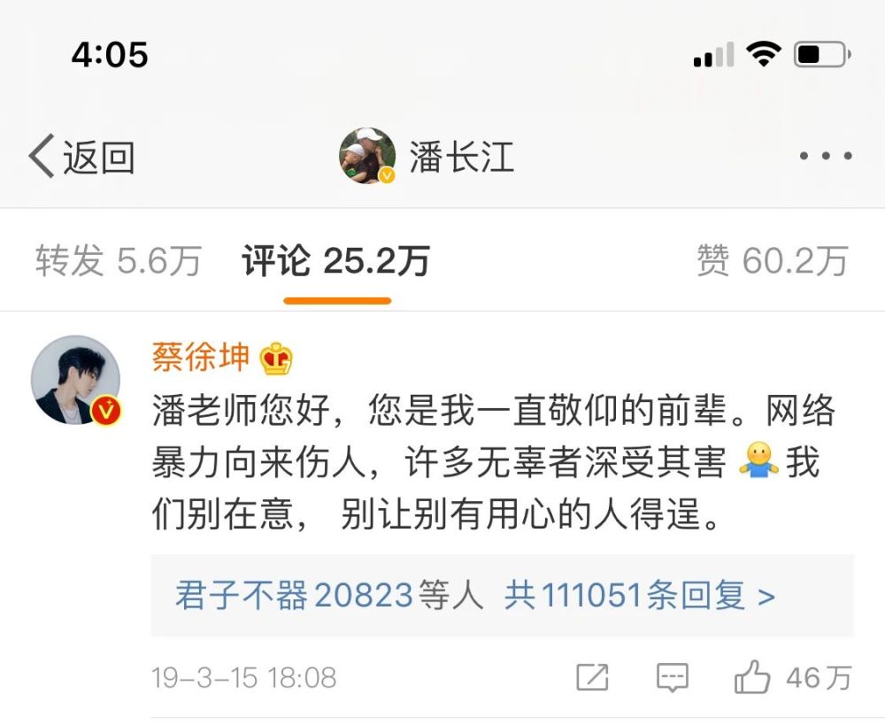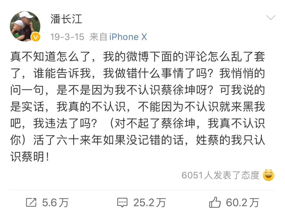 去年潘长江在《王牌对王牌》节目中,因为在“看图识人”游戏中,表示不认识蔡徐坤,被部分网友攻击,导致潘长江发博文诉苦。