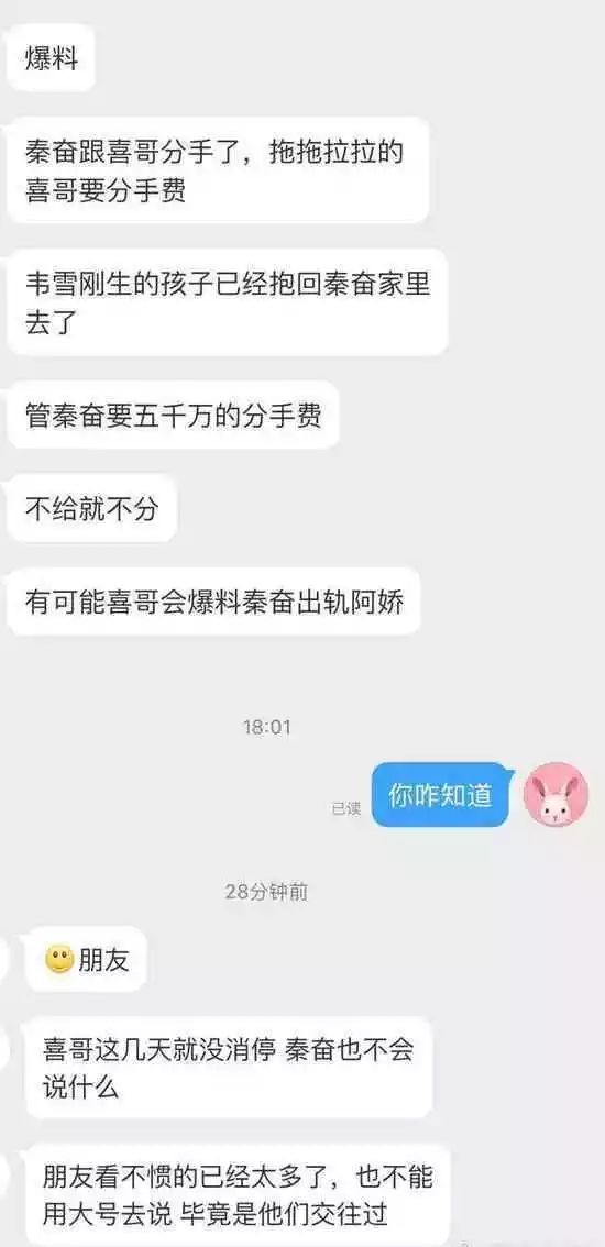 有网友爆料秦奋跟喜哥分手了,喜哥要5000万分手费,不给就要爆料秦奋出轨阿娇! 难道这一出都是喜哥自导自演的?