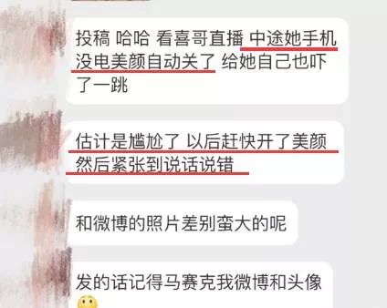 据粉丝投稿中说,喜哥有一次开直播,中途手机要没电,美颜模式就自动关了,关了之后她自己也吓了一跳,赶紧把美颜模式打开,然后说话有点慌。