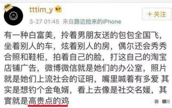 言语刻薄的暗示她不过是个花男人钱的高级鸡。