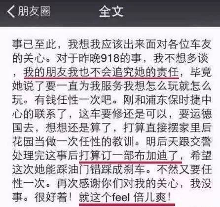 事后秦奋表示撞了就算了,懒得修了,直接换个布加迪吧。