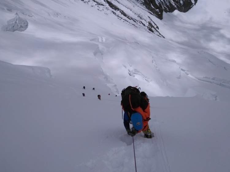 5月8日,因发现攀登路线上雪比较深,有流雪危险,测量登山队决定分两批撤回营地。