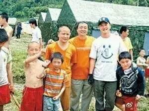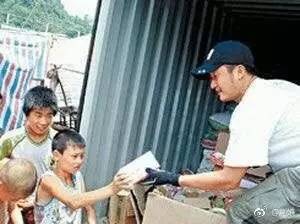 2008年汶川地震救援现场,吴京跟武警官兵一起抗包救灾,搬运物资。