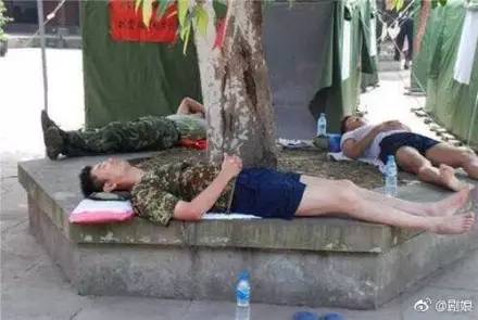 和当时救灾的解放军战士们同吃同住,累了就在花坛上躺一躺。
