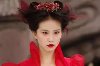 刘诗诗在《仙剑奇侠传三》扮演红葵时不仅穿了一身红色古装,头发染成红色、嘴唇涂成大红色之外,眼睛还戴了大红色美瞳,气质清新、模样清纯的诗诗看着像换了个人,戾气特别重。