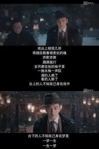 程凤台站在漫天大雪中,身影孤寂而悲凉,他说:“台上的人不知自己身在戏中,台下的人不知自己生在梦里,一生一梦,一梦一生。”