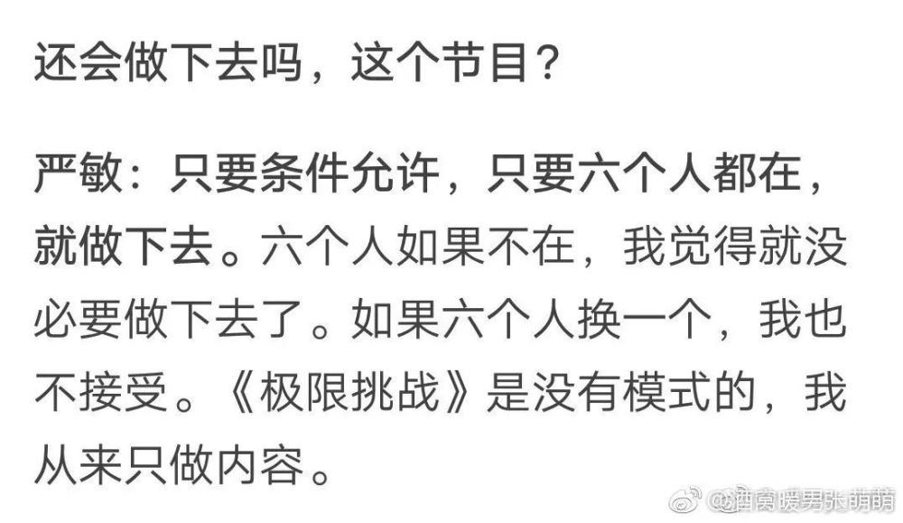 之前《极限挑战》的总导演严敏采访的时候说,只要条件允许,六个人都在,就做下去。说如果六个人换一个人,也不接受。《极限挑战》没有模式,从来只做内容。