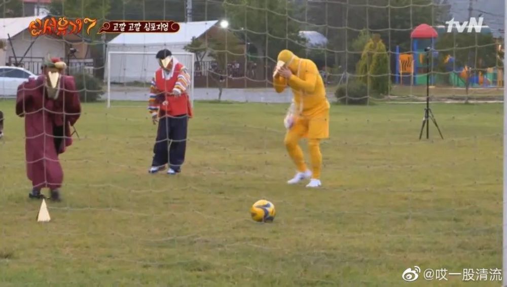 《极限挑战》里也是戴尖角帽踢球。