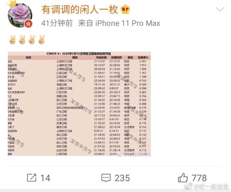 还发了一条《极限挑战》的收视率截图。