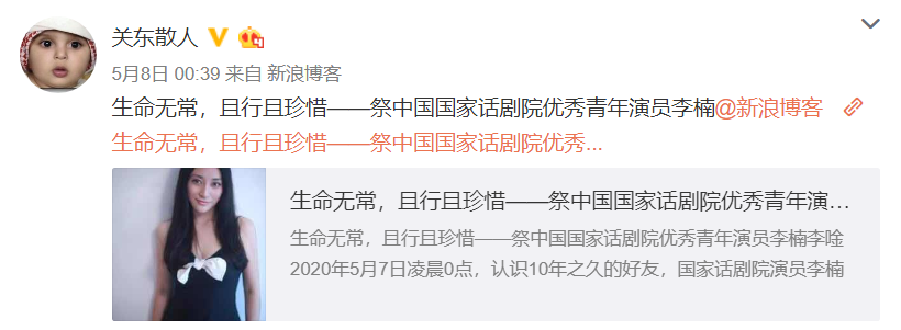 5月7日凌晨1点40分,国家话剧院演员李楠卵巢癌晚期抢救无效病逝,年仅39岁。