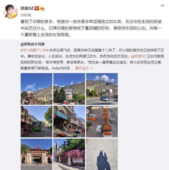 郑爽鼓励汶川粉丝 粉丝晒家园重建后美景,郑爽点赞