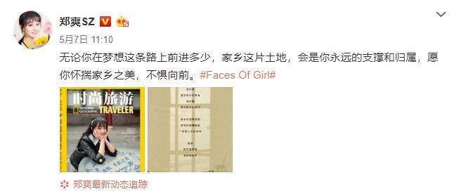郑爽写道“看到了你晒的家乡,相信你一定会是非常坚强独立的女孩,无论你在生活的旅途中经历过什么,记得你随时都有按下重启键的权利,请保持乐观的心态。向每一个重新爱上生活的女孩致敬。”