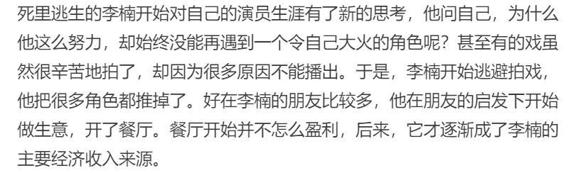 还好李楠是个心态非常好的人,作为他好友的郭凯敏就说,“他没有什么烦心的事”,所以就算回归演员的道路不是很顺畅,李楠也没有什么怨言,继续演他的小角色,没想到却险些因为一场马车戏丧命。