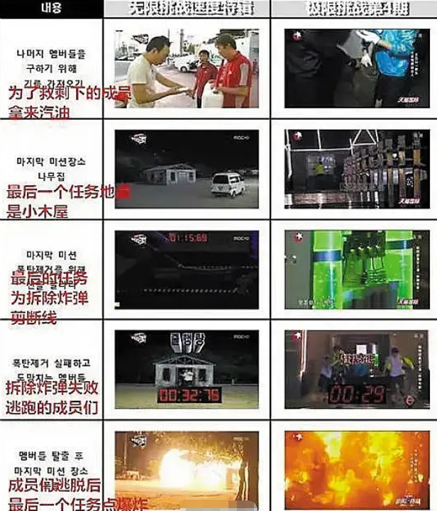 有网友做出了《极限挑战》抄袭的对比图,从第一季开始,极限挑战的内容跟韩国的《无限挑战》部分内容极为相似,几乎是原封不动照搬,比如说完成任务的方式,拆除炸弹,成员们逃脱后任务点爆炸等等,据悉《极限挑战》并没有获得韩国的《无限挑战》的版权。