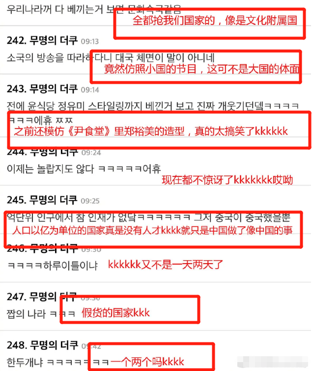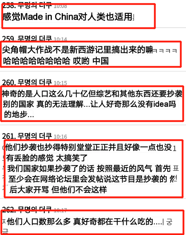 韩国网友针对这种现象表示了不满:“尖角帽大作战不是新西游记里搞出来的吗”“神奇的是人口这么几十亿但综艺和其他东西还要抄袭别的国家,真的无法理解……让人好奇那么没有idea的地步”“他们抄袭也抄得特别堂堂正正并且好像一点也没有丢脸的感觉,太搞笑了”“他们人口数这么多,真在好奇都在干什么吃的”。
