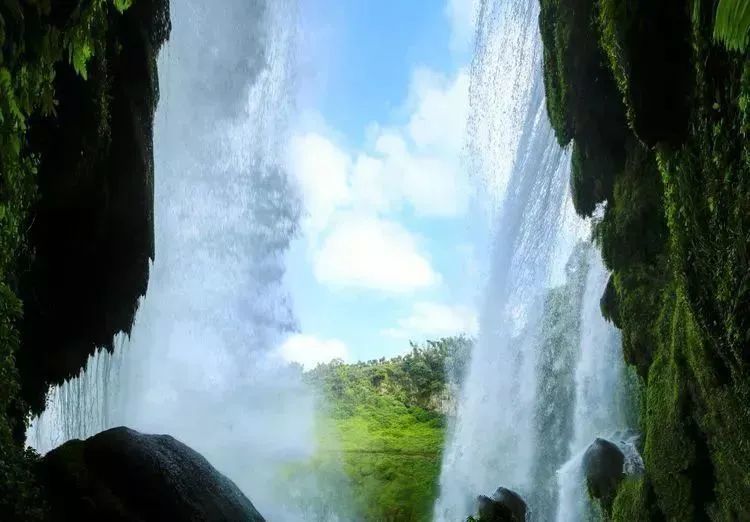 瀑布沿着峭立的岩壁飞泻而下,顿时抛洒万斛珍珠,溅起千朵银花,喷珠飞雪,壮如玉龙飞舞。仿若李白诗中所描绘的那种“飞流直下三千尺,疑是银河落九天”的真景象。