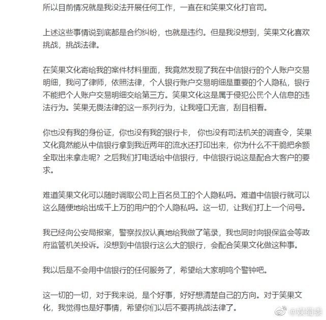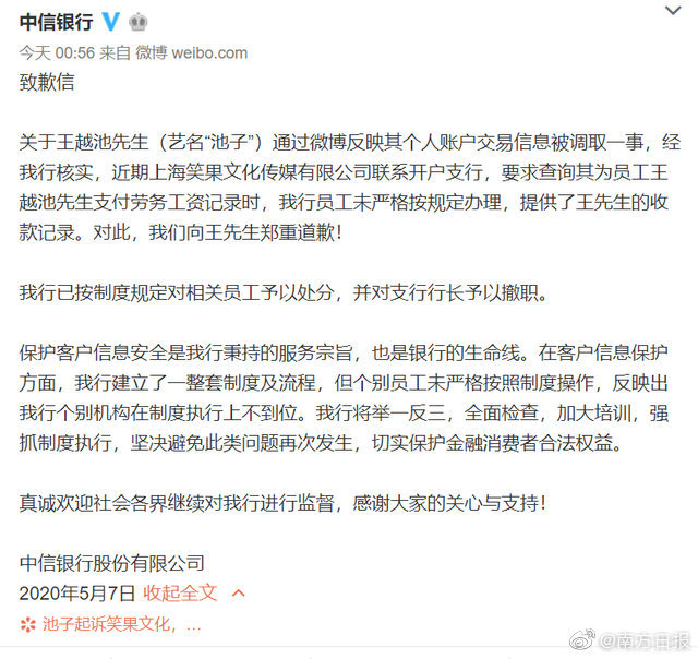 7日凌晨,中信银行官方发文道歉,对于向笑果文化提供信息的行为中信银行坦诚公示,并表示查询其为员工王越池支付劳务工资记录,行员工未严格按规定办理,提供了王越池的收款记录。同时中信银行已经将涉事员工和支行行长做出了相应的处分,而笑果文化岂不是又一次被打脸?