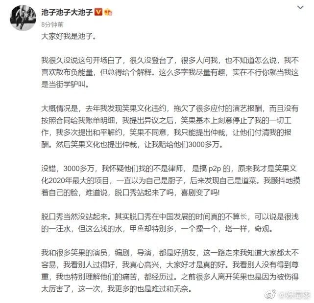 公司的法定代表人、最大股东为笑果文化创始人、董事长叶烽,其持股比例34.73%;华人文化集团的运营主体华人文化有限责任公司持股比例为9.70%。相比于他们,李诞只是一个小股东,池子的确和李诞关系很好,但这事已经不是李诞能左右的,而且部分网友认为池子发现笑果拖欠演出报酬并要求支付――笑果拒付后停止池子工作――池子因没有收入才“未经公司允许参加商业活动,难道这才是真正的时间线?