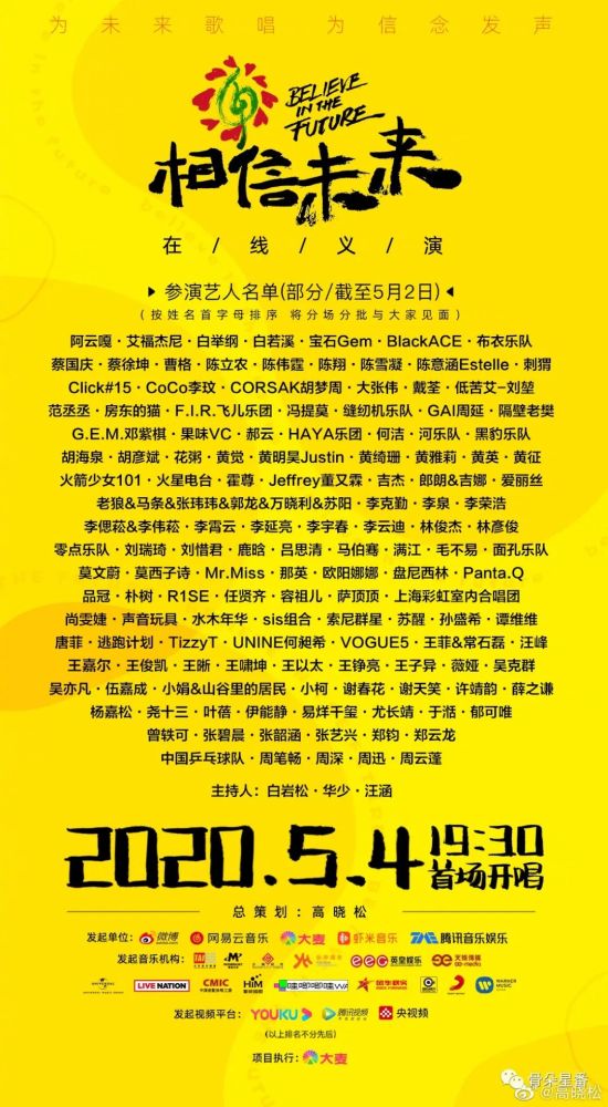 另外,从“参演艺人名单(部分/截止5月2日)”看,这场线上音乐会邀请到的还包括谢春花、花粥等从网络中火起来的原创音乐人,同样面临着这个境况,也是“后华语乐坛”的关键词。