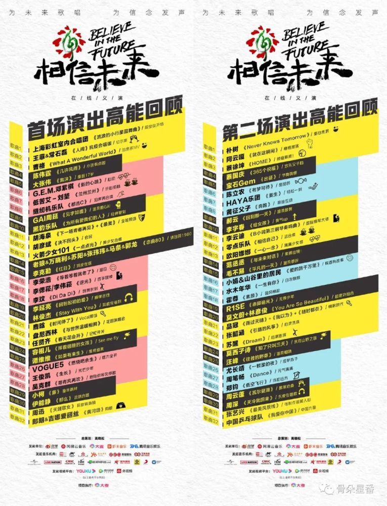 在还未进行的另一半义演当中,老将如黄绮珊、那英,大热流量如吴亦凡、王嘉尔、黄明昊、王子异,还有实力歌手尚雯婕、薛之谦、张碧晨等人,都将一一亮相。还有这样一批乐坛的“前浪”和“后浪”,不知将以何种风格和形式,跟期待着他们的所有人相见。