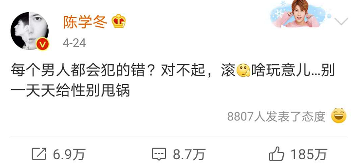 其实陈学冬三观一直都很正,前段时间面对罗志祥事件的那句:他只是犯了男人都会犯的错,陈学冬硬性开杠说:每个男人都会犯的错?对不起,啥玩意,别一天天给性别甩锅。
