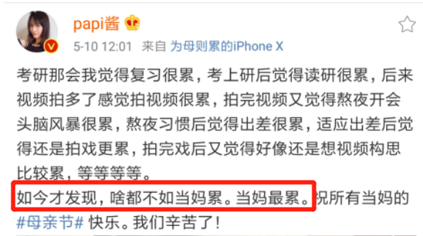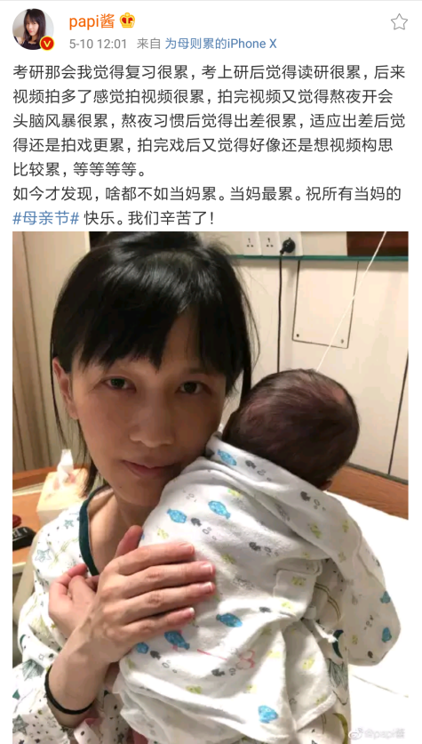 起因是母亲节,她发了一条吐槽育儿辛苦的微博。