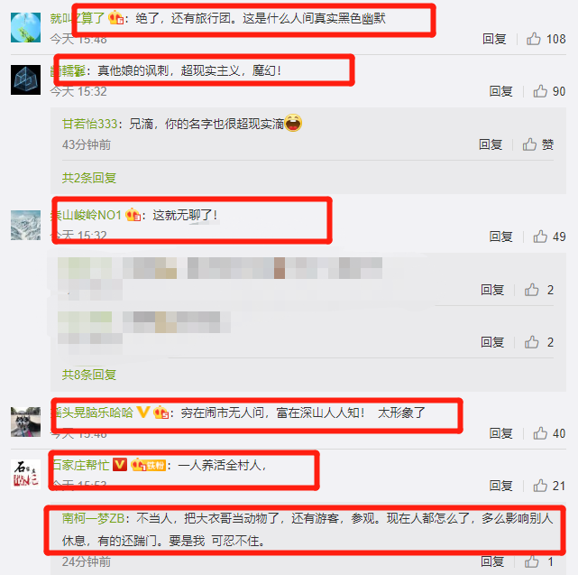对于大衣哥而言,他以自身带动全村经济的发展,众人想利用他发展“大衣哥文化”,以此获取利润,却从来没有人考虑过大衣哥的想法,有网友对此评价:“绝了,还有旅行团,这是什么人间真是黑色幽默”“超现实主义,魔幻”“一人养活全村人”“要是我可忍不住”。