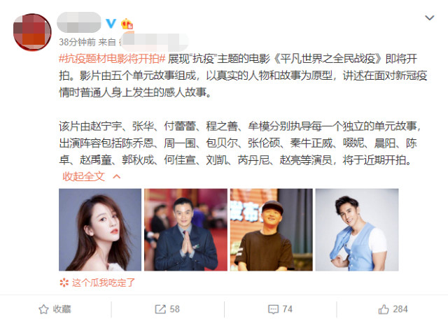 5月12日,有官方账号公布了一则抗疫电影的筹备信息。作为 展现“抗疫”主题的电影,这部《平凡世界之全民战疫》也赚足了不少网友的眼球,如何通过镜头把疫情期间感人至深的故事讲出来,这也考验着导演和编剧的功力。据悉,该影片将由5个单元故事组成,会以现实生活中的真实人物和事件为原型,讲述平凡大众在抗疫期间的温情故事。