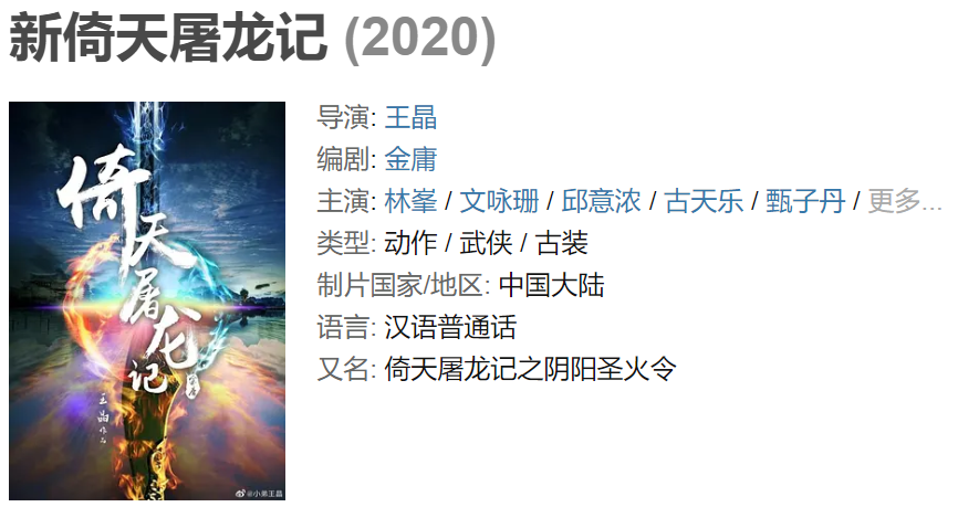 据悉,早在2020年的1月2号的时候,《倚天屠龙记之阴阳圣火令》就已经在浙江新昌的十九峰景区正式开机拍摄了。目前从《天屠龙记之阴阳圣火令》在豆瓣显示的资料来看,该片很可能会在2020年与大家正式见面(也算是指日可待了呢)。
