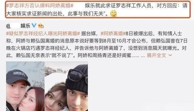 据台媒所言,赖弘国意外偶遇了罗志祥经纪人。在聊天过程中,赖弘国透露与阿娇离婚事实。此后便曝光离婚消息,一众媒体怀疑背后有内幕。