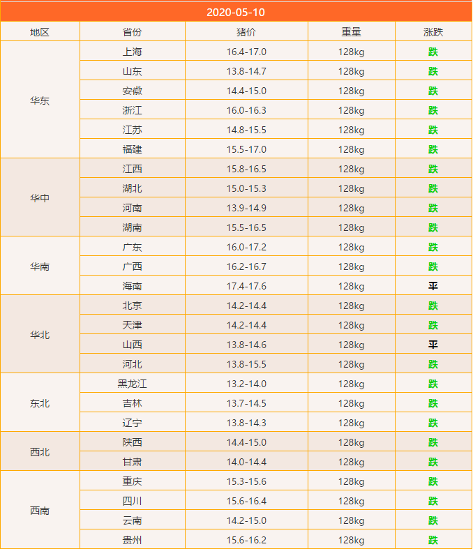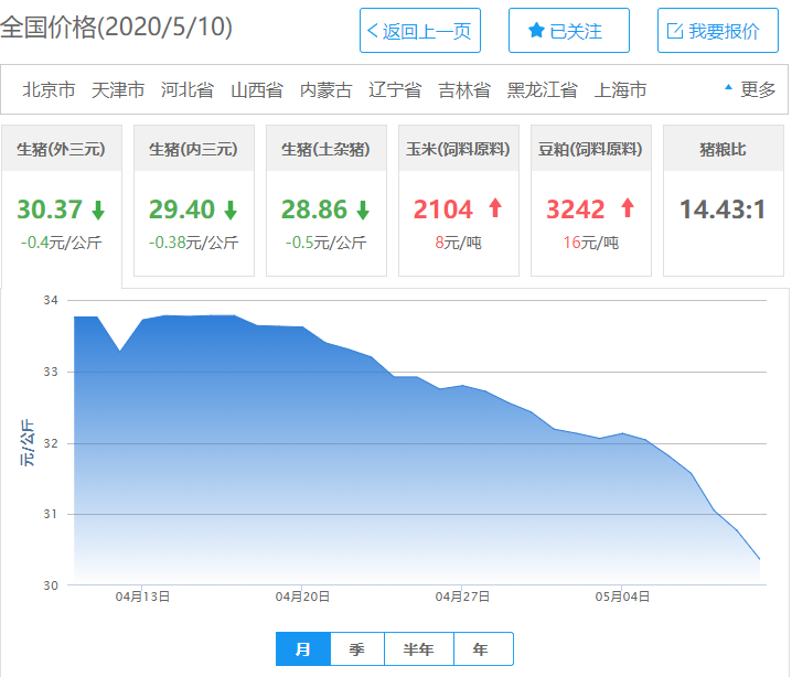 今日全国2020年5月10日猪肉价格