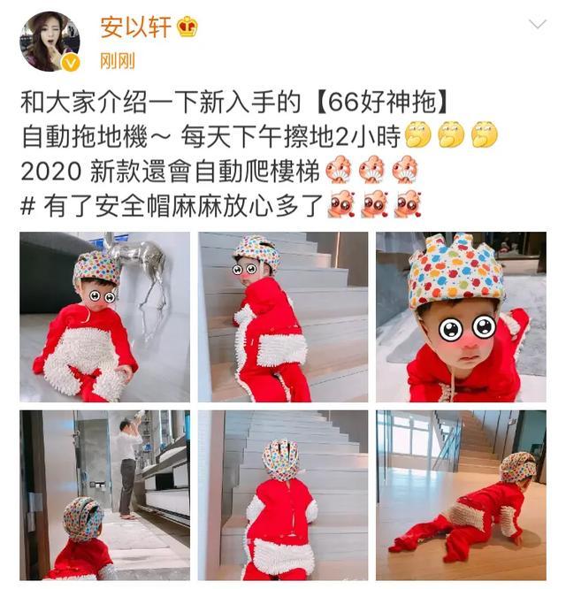 4月26日,安以轩在社交平台晒出儿子66的萌照,并配文“和大家介绍一下新入手的(66好神拖)自动拖地机~ 每天下午擦地2小时,2020 新款还会自动爬楼梯,有了安全帽麻麻放心多了”。