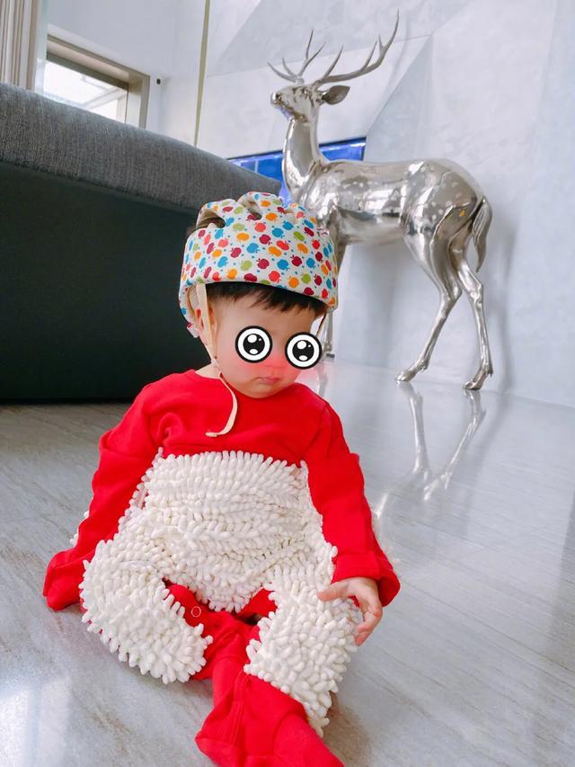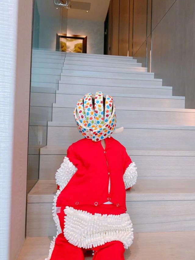 安以轩还给儿子戴了一个“安全帽”防撞,简直超贴心。不过虽然说有“自动爬楼梯”的功能,但话说家里豪宅这么大也太累了吧。
