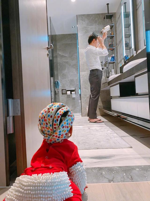 66爬到浴室门口找爸爸,不过爸爸正在认真吹头发做发型,似乎没注意到儿子的行踪呢。陈荣炼身穿白色衬衫和西裤打扮超帅,虽说本来就是现实中的总裁,但不得不说这个出镜方式真的“总裁范”十足呀。