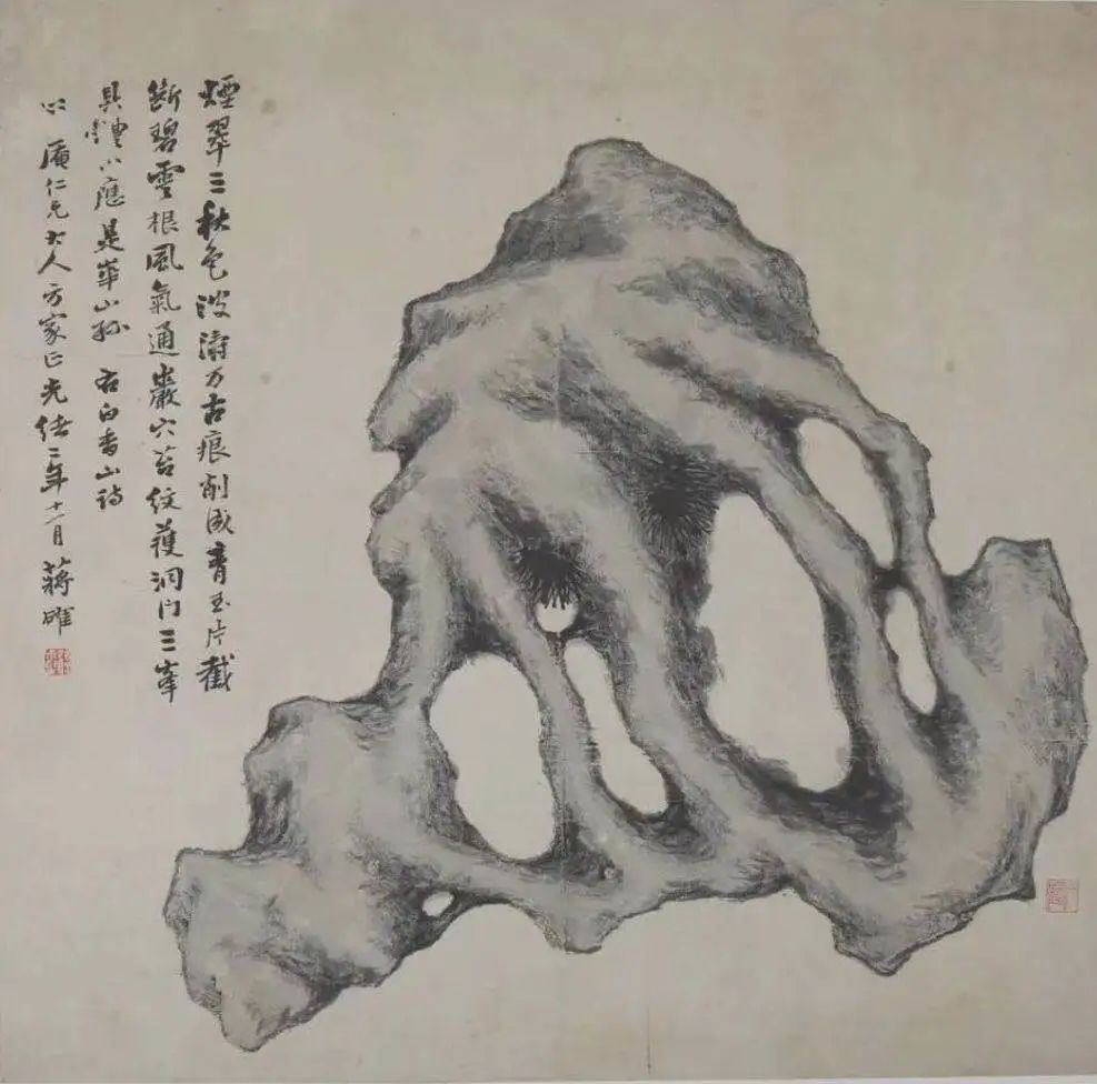 晚清民国,最后的文人士夫们,在风云变动之际,仍然保有旧时的从容与体面,保留着赏石、写石的雅兴,近人吴湖帆曾对着苏州城北阊门外的巨石写生,这块巨石,相传是宋代花石纲遗物。溥心畲曾书大字――“枕石漱流”,枕石漱流的心境,与赏玩奇石又不相同,大概是“恬淡于浩然之域”的回归。