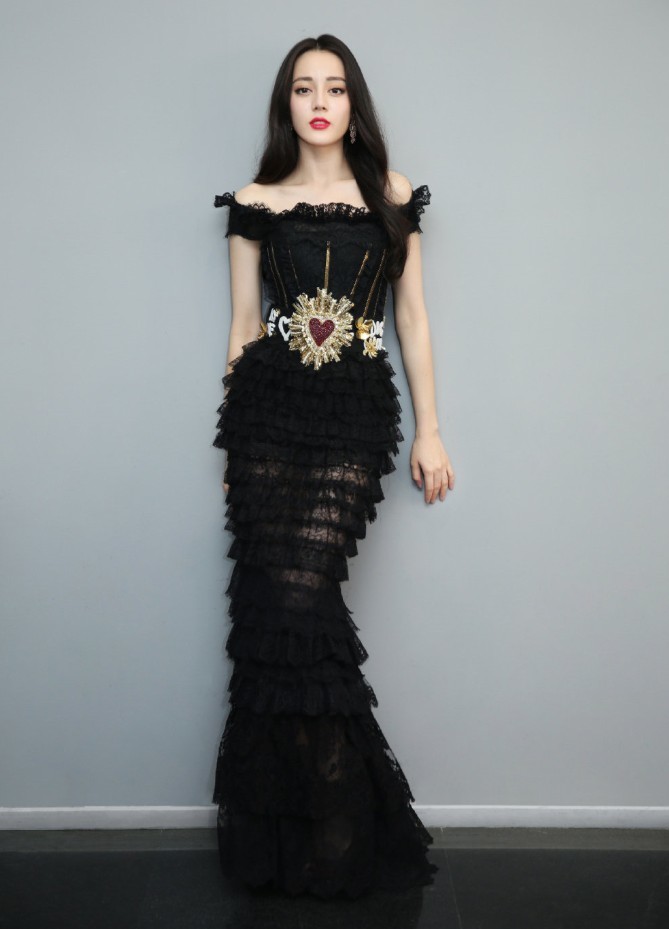 当穿上一条黑色长裙的热巴也是蛮有魅力的,因为她身上的这条长裙都是一层一层的黑纱叠加而成,所以衬得她的造型很有层次感,不会觉得单调,一字肩的衣领上增添了黑色蕾丝边做装饰,衬得她的形象更清新一些,修身的长裙用腰带修饰,勒出了腰身,还衬得她整体身材十分高挑!