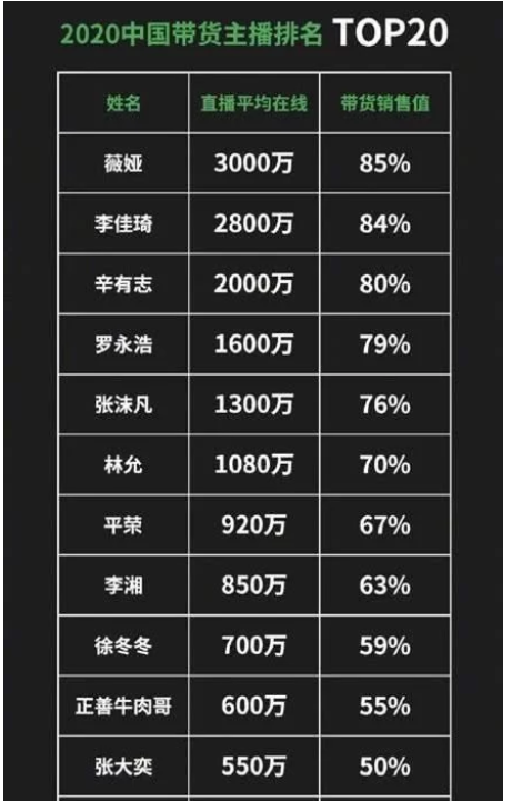 说到李佳琦,大家都有知道他是带货一哥,成绩一直以来都有目共睹,在最新公布的“2020带货主播排名TOP20”中,李佳琦就以直播平均在线2800万的成绩占据第二名,第一名的是薇娅3000万,两人仅差了200万。