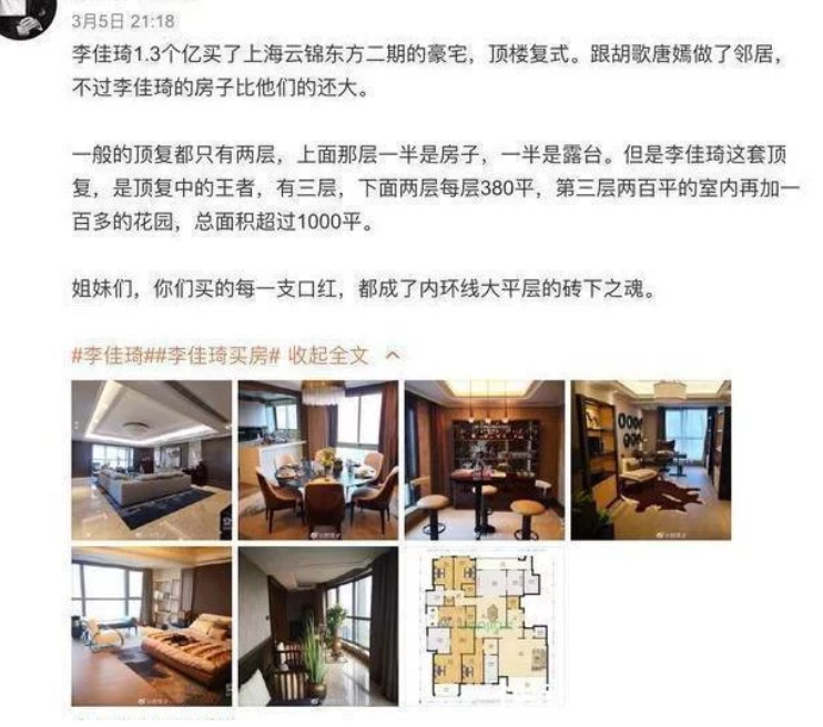 据网友爆料李佳琦的豪宅在上海云锦东方二期,而且是顶楼复式。一般的顶复都只有两层,但是李佳琦这套是三层,面积加起来超过1000平,而且据说胡歌、唐嫣都在这个小区,也是就说李佳琦和你们的男神胡歌成了邻居,让人羡慕吧!