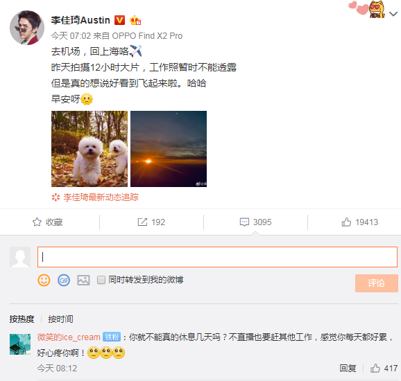 李佳琦基本处在全年无休的状态,一年高达300多长的直播记录,也是看出他的勤奋和热度,这不,今天一大早李佳琦就发微博称自己要去机场返回上海,昨天在外地拍摄了12小时的大片。即使是不在直播也要赶其他工作,粉丝们也是希望他能休息几天,不要这么累了。不过全年无休的李佳琦身价不菲,又有亿元豪宅加持,他的所有付出都是有回报的。