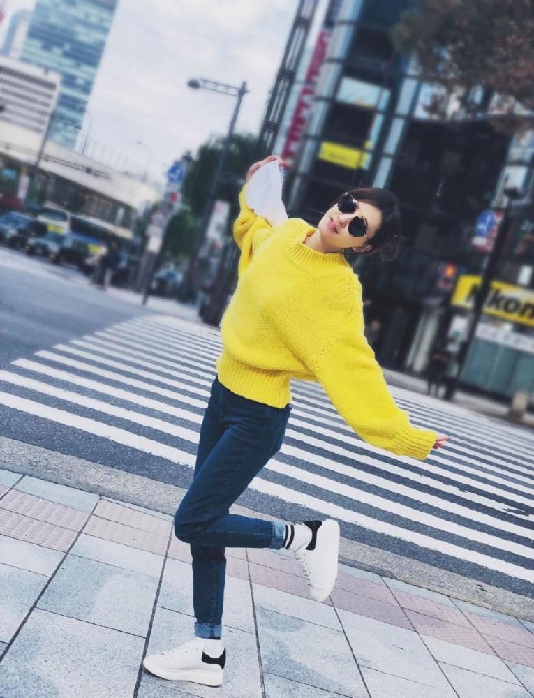 这次王丽坤走的是休闲路线,身边一件黄色针织衫,搭配一件牛仔裤,这种简单随性的搭配特别的有朝气,活力满满。