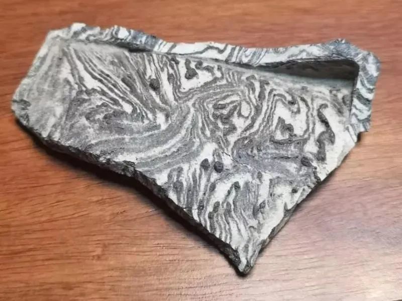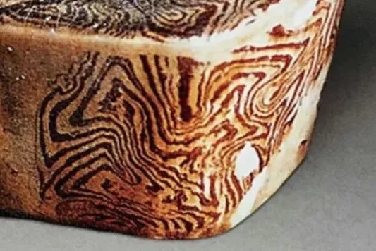 再有,拉坯成型后形成的绞胎纹理形态,绝不会像木纹理,会像大理石纹理,条纹会有从浅到深的过渡变化(如下图)。