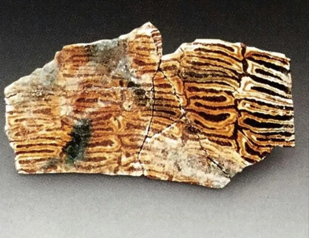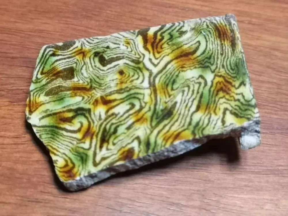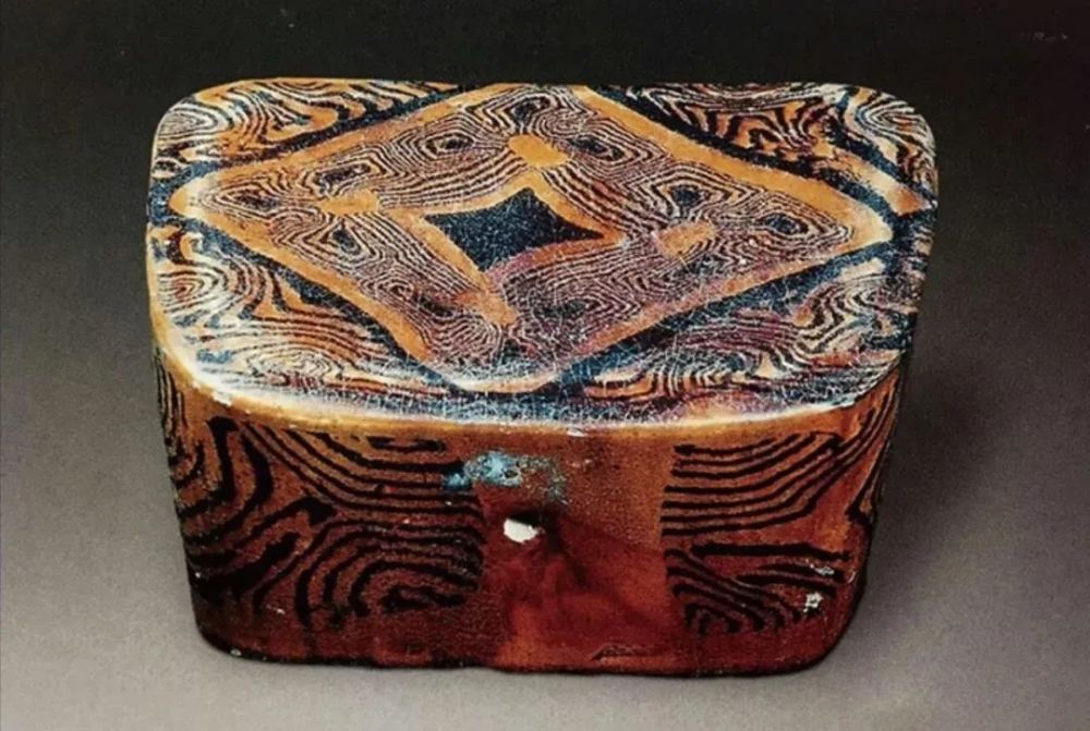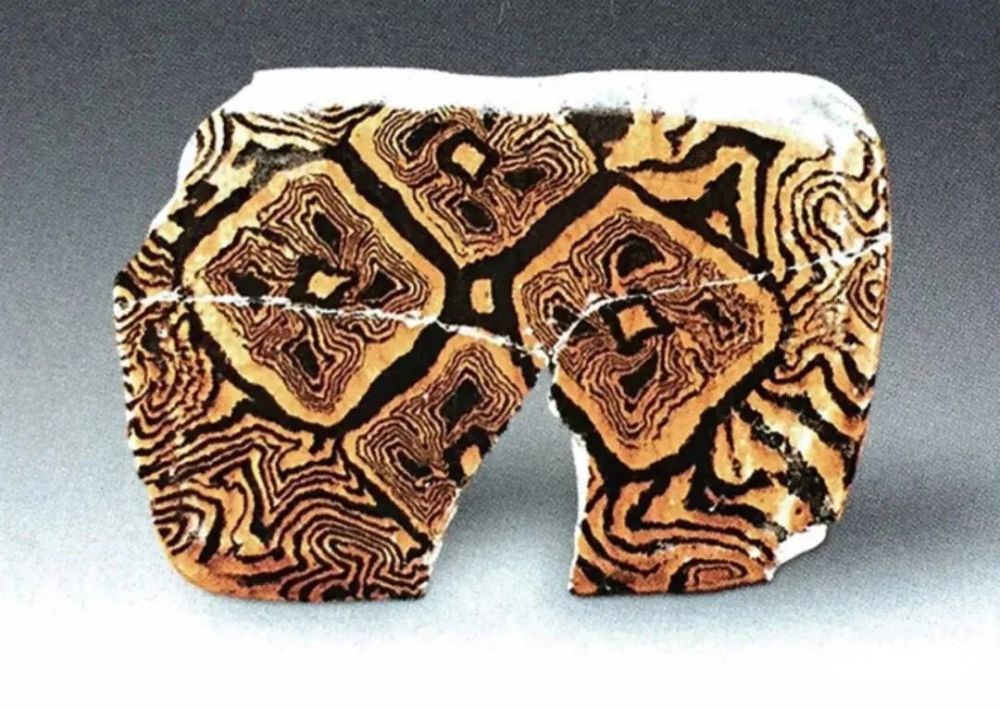 上图是一个巩县黄冶窑址出土的全绞胎回形带纹枕残片,可以清楚地看到绞胎泥片摆放情况,即几字纹、回形带纹理形成的原理与方法。