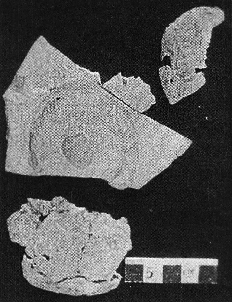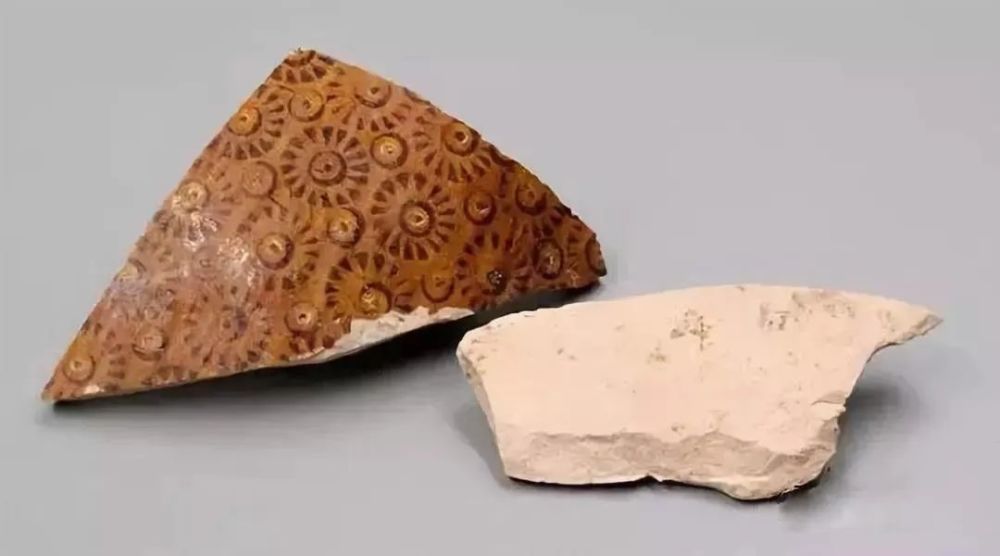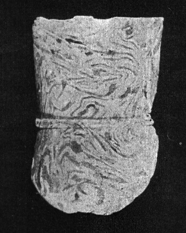 或许有人仍会提出,玻璃与陶瓷毕竟是两种材料、 两种工艺,仅分析它们在工艺技术上的相同点、类似性, 并不能证明是玻璃工艺影响到陶瓷工艺。换句话说,就是不能证明绞胎工艺来源于西方的玻璃融合技术。屈志仁先生在《绞胎、“绞釉”与流沙笺》一文中例举了在西亚努兹古城(今伊拉克境内)遗址出土的两片“绞胎” 陶残片,时代约公元前15~14世纪: