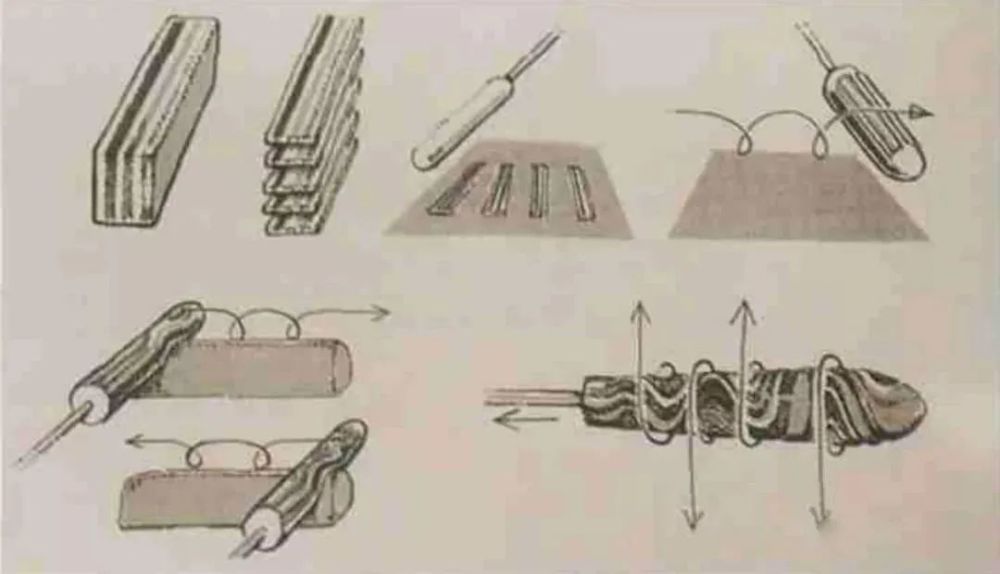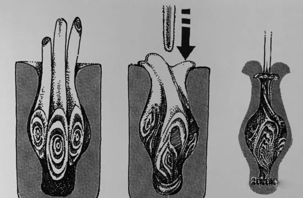 上图为亚历山大时期的玻璃容器,就是将带有纹理的玻璃棒融合,通过中心金属棒的操作形成统一整体,然后研磨抛光以展示其纹样。具体方法如下图演示 :