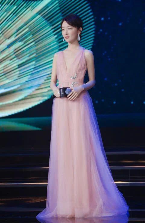 周冬雨作为一名90后的影星,自然是比较年轻有活力,因此像粉色这类裙装,驾驭起来不仅不再话下,像粉色自带的减龄甜美感也能完全的映衬在镜头之下,除此之外,这款礼裙的面料设计还采用着比较常见的纱质面料去设计,加以肉粉色彩的映衬,还有着比较唯美浪漫的即视感营造,再搭配拖地式的长裙作为下摆设计,还完美地呈现出优雅大气的成熟魅力。