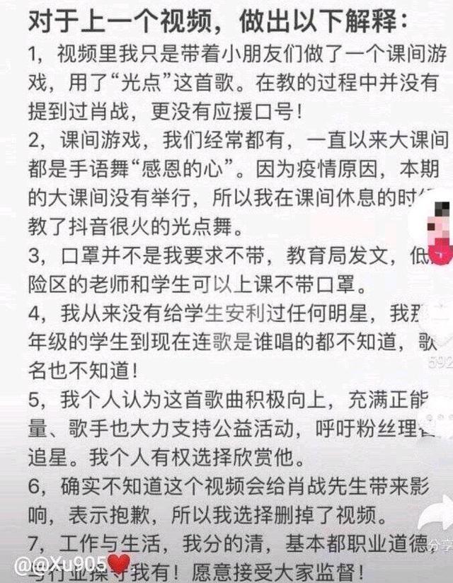 对此,当地教育局通过媒体表示已经接到了很多类似的投诉,经过核实视频中的老师确实是当地的,目前教育局正在对此展开调查。而不久之后,发布应援视频的老师也在自己账号上进行道歉并澄清。该老师表示这只是一个课间游戏而已,没有提到肖战,也没有应援口号。此外自己从来没有向学生们安利过明星,甚至连歌曲谁唱的都不知道,选这首歌只是因为它正能量。