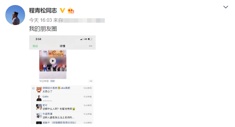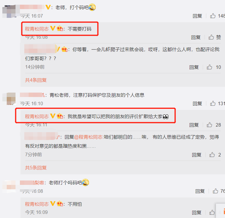 网友们在看到程青松直接晒出朋友圈后,纷纷留言表示要他帮朋友们打个码,以防这些人被肖战的粉丝攻击,但程青松显然不怕,他直言“不需要打码”“我就是希望可以把朋友们的评价扩散给大家看”。